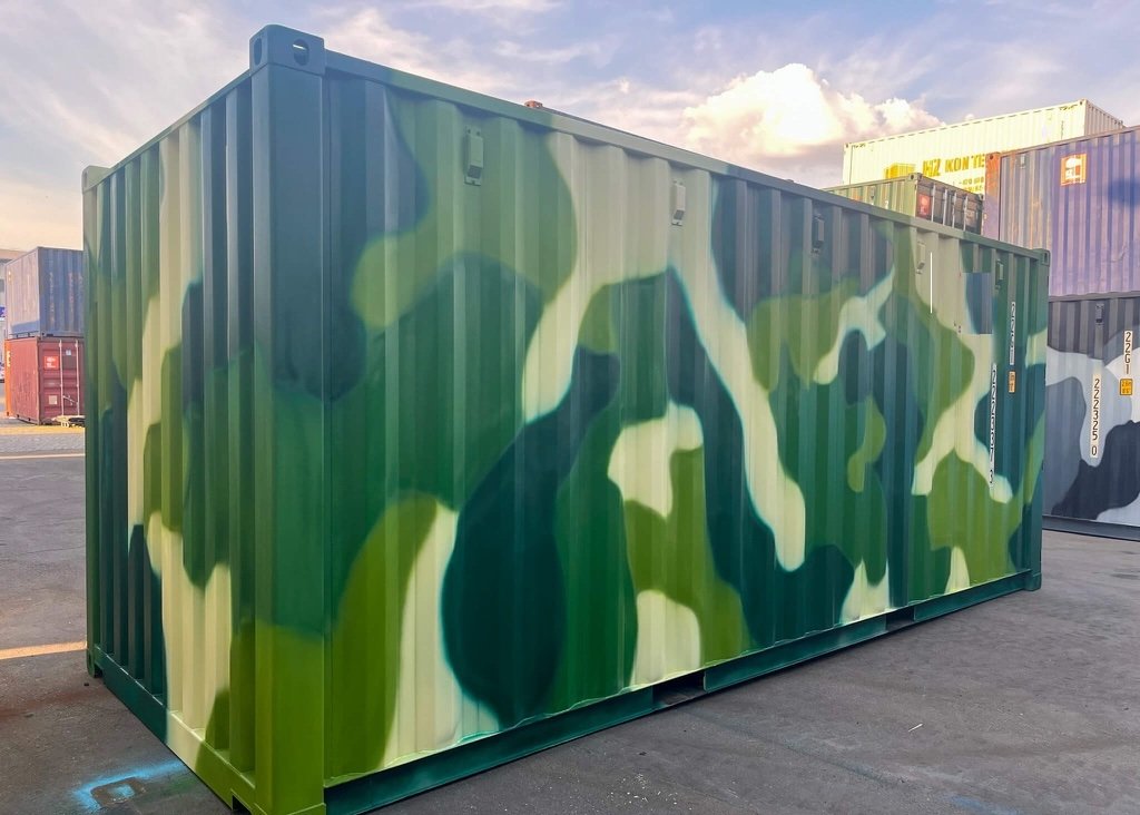 Este contenedor marítimo de 20 pies con diseño camuflaje es perfecto para quienes buscan una solución de almacenamiento segura, robusta y con un estilo único.